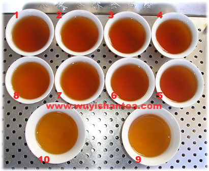 | 湯色變化情況:第一泡至第八泡時(shí)長分別為:15秒、25秒、40秒、1分鐘、1分鐘15秒、1分鐘30秒、1分鐘45秒、2分鐘,第九泡時(shí)長2分半鐘,第十泡時(shí)長3分鐘。 開水一沖入,有馥郁的甜香馬上飄出,這就是特好茶的陳放結(jié)果。滋味有豆?jié){感,回甘很甜、持久,陳了幾年,沒有陳味慢慢明顯,香氣、滋味變得更加沉重,好茶! 后期的香氣轉(zhuǎn)成似粽葉香的陳味。 |